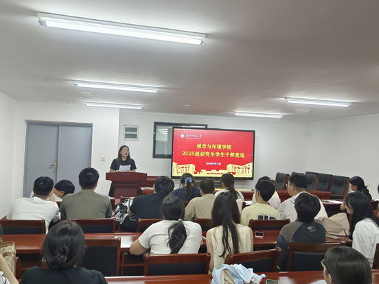 为确保研究生新生班级管理工作有序推进,充分发挥班委在师生联络与班级建设中的核心作用,9月16日下午,城市与环境学院于资环大楼7406会议室组织召开2025级研究生班委竞选会议。会议由辅导员陈爽主持,2025级全体研究生参与。