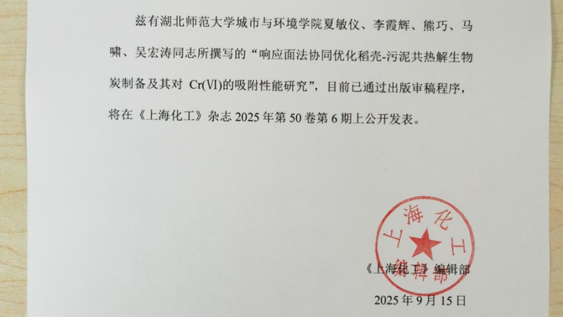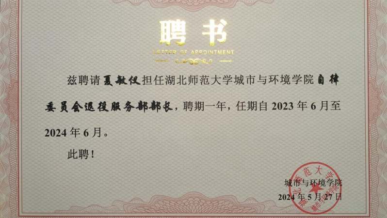 夏敏仪,中共预备党员,湖北师范大学城市与环境学院2022级环境工程专业本科生。现任班级青小队与社调委员,曾任城环自律委员会退役学生服务部负责人、磁湖文学社活动部工作者。前三学年加权成绩名列班级前茅,连续三年两次获二等校级学业奖学金、一次获三等校级学业奖学金;获院级“优秀学生干部”、院级“优秀个人”、校级“优秀会员”荣誉称号。获国家级大创1项、中国国际大学生创新大赛(2024)省级银奖、第十三届“挑战杯”大学生创业计划竞赛省级铜奖、湖北师范大学2025年“理耀黄石”宣讲达人赛三等奖、湖北师范大学2024年暑假社会实践调查报告优秀奖等,以第一作者在省级期刊上发表学术论文一篇,以参与者在《中国农学通报》期刊上发表学术论文一篇。