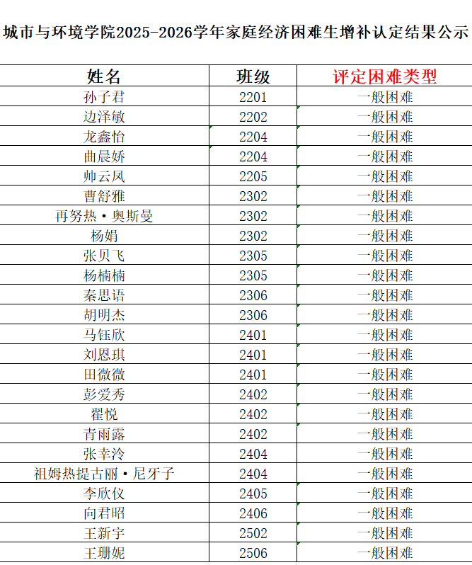 根据《关于做好2025-2026学年家庭经济困难学生认定工作的通知》文件精神,我院2025-2026学年贫困生认定工作已经结束,后经学生申请,班级民主评议,学院审核通过增补入库一批家庭经济困难学生,现将认定结果进行公示。