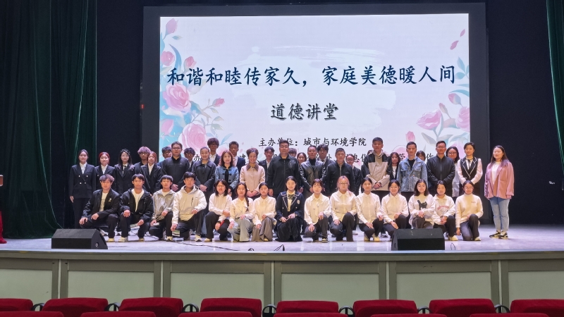 为深入推动精神文明建设,传承与弘扬中华优秀传统美德,10月23日晚,城市与环境学院联合基建处、国际交流合作处、信息化建设与管理工作处,于学校大礼堂共同举办了以“和谐和睦传家久,家庭美德暖人间”为主题的道德讲堂活动。活动旨在通过家风建设带动社会公德建设,营造崇德向善的良好氛围。